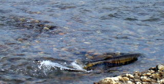 この川で生まれたサケは、海に下り、3,4年後同じ川を遡り、